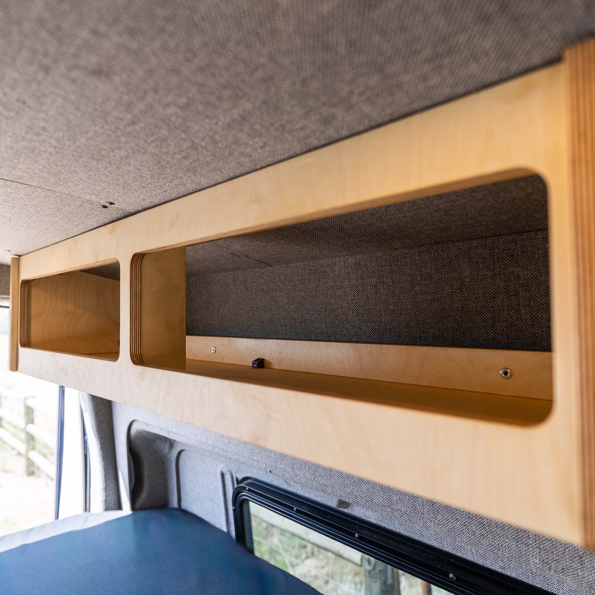 Add more storage space to your Mercedes Sprinter van. This easy-to-assemble Van Shelf Kit comes with all of the materials that you need to build professional quality shelving for your conversion van. Baltic Birch Plywood is strong, durable, and has a real wood finish. Our cabinetry now includes installation instructions and hardware. Our product will work best with our structural assembly kit.