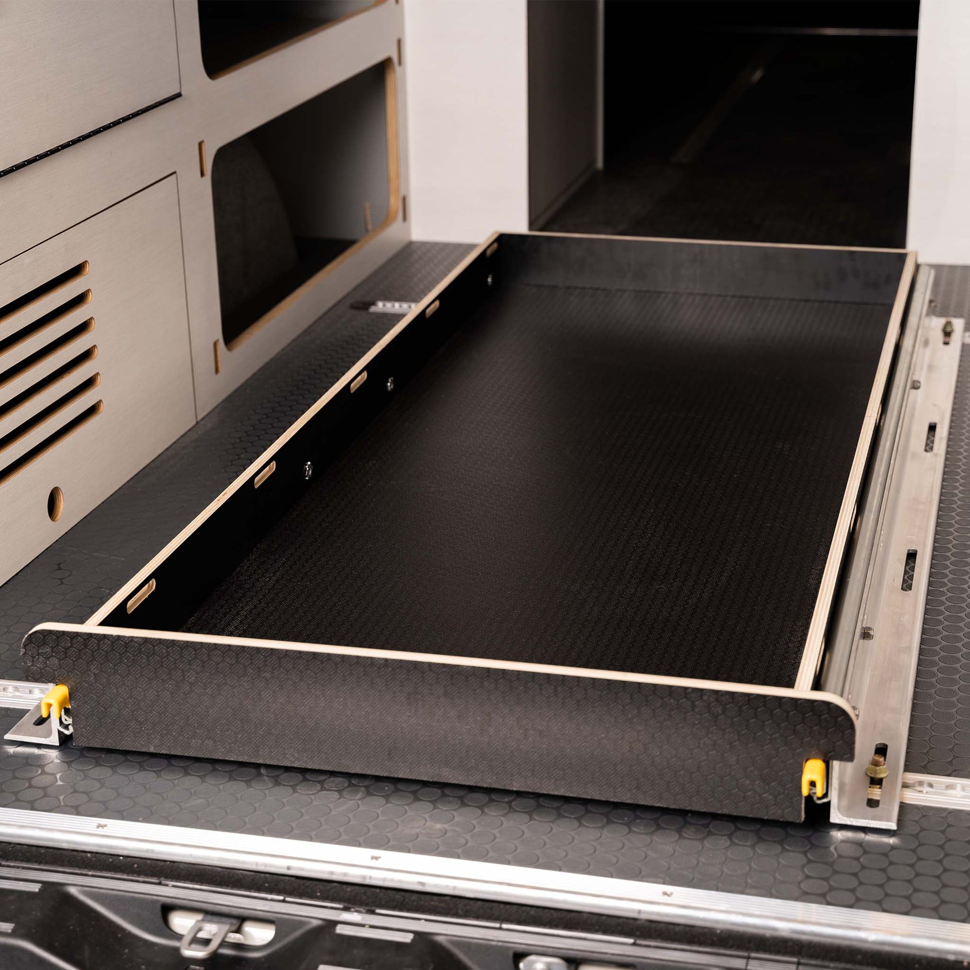 The Slide-Out Bike Tray is a convenient storage solution designed for vans with suitable garage spaces, such as beneath a bed system. This tray works perfectly under our Timber bed system and is compatible with any van type. Featuring heavy-duty slides rated for up to 500 lbs, the tray extends a full 56" for easy rear access. Whether used for securing mountain bikes with fork mounts or strapping down coolers and gear, this tray offers unparalleled versatility. It keeps grime contained after outdoor adventures, preventing messes on your van floor. A built-in drainage hole with a rubber plug makes cleanup easy and hassle-free.