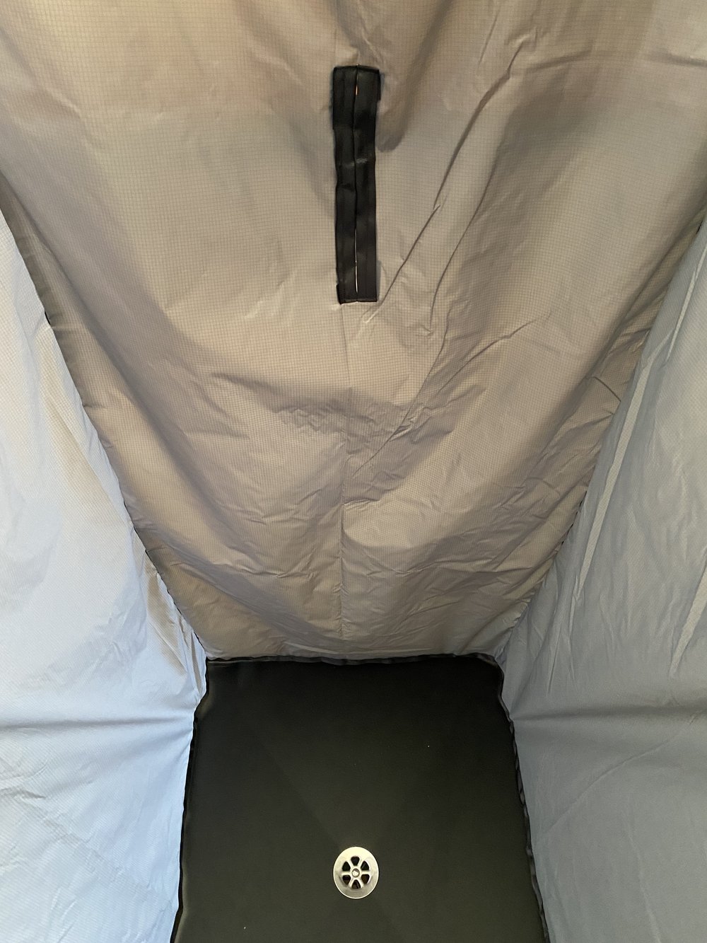 The optional curtain is sized to match the pan precisely and features magnets sewn into the edges to attach securely to the pan. It includes a watertight magnetic front closure for easy access and is designed to flare outward for increased shoulder space. Adjustable mounting is made easy with both loops and grommets at the top.