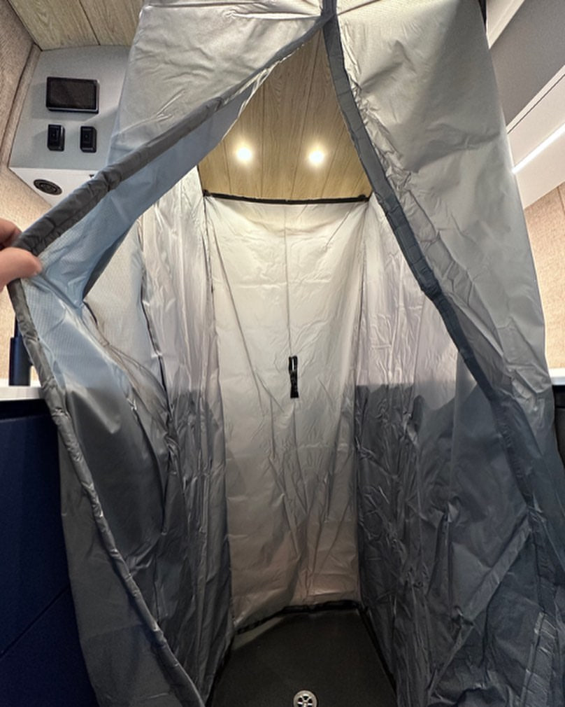 The Tetravan In-Floor Shower Pan is designed to be seamlessly recessed into the surface of your camper van floor—out of the way, but hidden in plain sight. This low-profile design is a smart, space-saving alternative to the Tetravan Folding Shower and an excellent option for taller van dwellers, as it maximizes standing headroom.